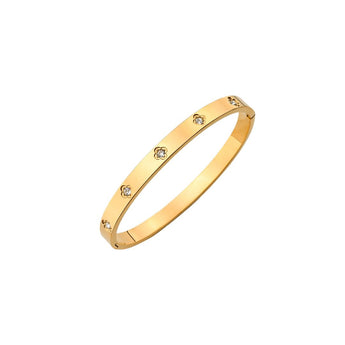 A sleek bangle bracelet embedded with clover shaped cubic zirconia. Secured by a side latch closure - lift latch, pinch ends, and pull apart to open.